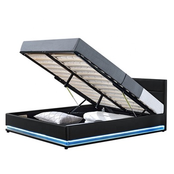 מיטת אחסון מעור שחור בגודל כפול מודרני עם LED על ראש מיטה בסגנון פאנל ריפוד רך לשימוש ביתי